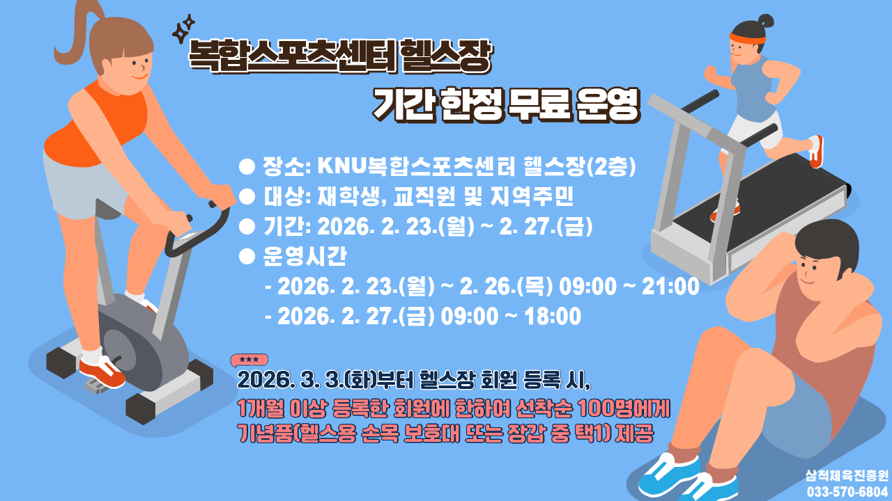 1. 삼척체육진흥원에서는 KNU복합스포츠센터 헬스장을 재학생, 교직원 및 지역주민을 대상으로 기간 한정 무료로 운영하고자 합니다.